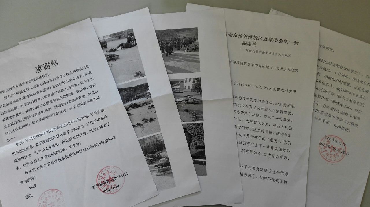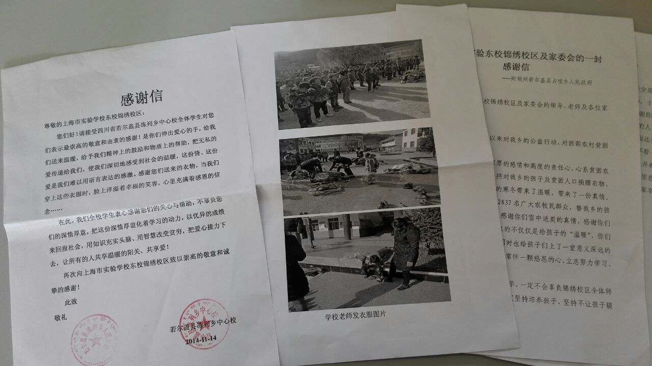 2014年11月11日,四川若尔盖县占哇乡中心小学发给锦绣校区的感谢信到了!